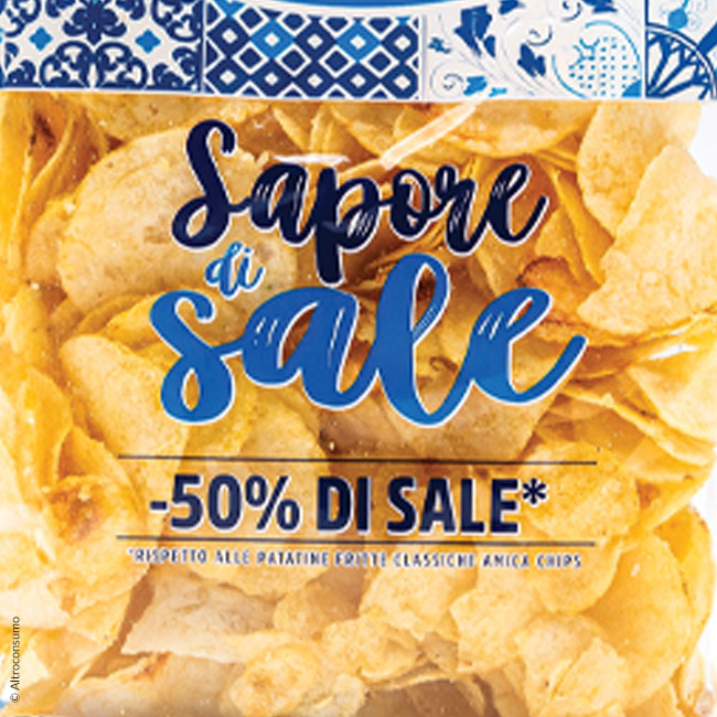 Il contenuto di sale nelle patatine è spesso molto alto, e questo è uno degli aspetti nutrizionali che portano al consiglio di consumarle saltuariamente, perché troppo sale fa male. Dimezzarne il contenuto (come dichiarano diversi claim simili a quello cui sotto) può essere interessante per il consumatore, ma anche in questo caso bisogna fare attenzione