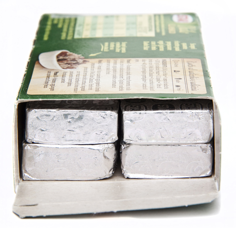 La scatola che contiene i classici dadi è facile da schiacciare e occupa poco spazio. Essendo di carta, deve essere buttata nella raccolta differenziata di questo materiale. La pellicola argentata che avvolge i dadi, invece, va buttata nell'indifferenziata. Tra un dado e l'altro nella scatola non c'è spazio vuoto: significa che il packaging è perfettamente dimensionato sul prodotto. La forma compatta e squadrata ottimizza lo stoccaggio e il trasporto. Con 1 cubetto di dado si ottengono 500 ml di brodo, le confezioni sono da 12 o 24 dadi. In media per 1 litro di brodo usiamo 1,5 g di imballaggio, quasi completamente riciclabile.