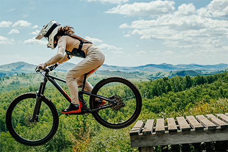 - i caschi per downhill, enduro o altre discipline “gravity” ricordano i caschi integrali da moto: sono in effetti dei caschi bici integrali, dotati quindi anche di una parte che avvolge e protegge il viso, lasciando scoperto lo spazio per la vista. Proteggono quindi il cranio, la nuca ed il volto da impatti potenzialmente più forti che nelle altre discipline.