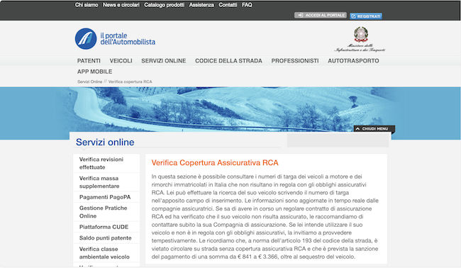 - scegli la sezione "verifica copertura assicurativa",