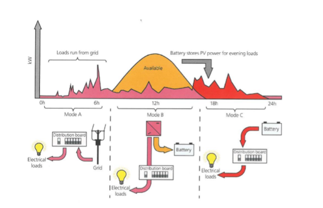 Nelle prime ore del mattino (modalità A), le utenze di casa sono alimentate dalla rete elettrica, dato che non c’è produzione solare. Durante le ore di presenza del sole (modalità B), l’impianto fotovoltaico copre i consumi, e con l’eccesso di energia ricarica il sistema di accumulo (la batteria). Durante le ore serali e notturne (modalità C), l’energia accumulata nella batteria può essere usata per coprire il fabbisogno di elettricità, fino a che la batteria non è scarica.