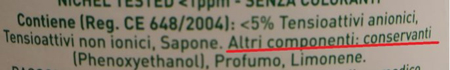 L'informazione sui conservanti è presente solo nei prodotti che contengono sostanze (ad esempio phenoxyethanol, methylisotiazolinone, etc) utilizzate per mantenere in buono stato i prodotti stessi, che contenendo molta acqua potrebbero essere terreno fertile per la proliferazione batterica. La presenza di conservanti non è quindi di per sé un aspetto negativo, però alcuni (come i tiazolinoni) sono pessimi per l'ambiente e possono provocare reazioni indesiderate all'uomo. Nessun problema per la presenza di fenossietanolo nei detersivi (mentre lo sconsigliamo nei prodotti destinati ai bambini piccoli da applicare sulla pelle).