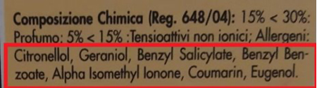 Questa informazione è presente solo nei prodotti profumati o con olii essenziali che contengono una o più sostanze classificate come frequenti allergeni (come citronellol, linallol, limonene, etc) che servono per dare piacevolezza al prodotto. È utile per chi è allergico, per chi è sensibile o in caso di reazioni avverse durante l'uso. Via libera se si tratta ad esempio di un detersivo pavimenti (anche se, in genere, gli allergeni hanno anche un impatto ambientale negativo), ma sconsigliamo prodotti con lunga lista di allergeni per prodotti che vanno a contatto con la pelle come i detersivi lavatrice, gli ammorbidenti o i detersivi piatti a mano (anche se sarebbe meglio usare sempre i guanti). La presenza di profumo non porta necessariamente con sé allergeni: ci sono prodotti profumati senza allergeni.