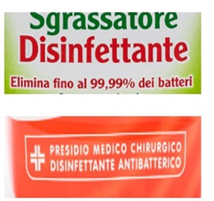 I prodotti per la pulizia che vantano claim come "disinfettante" o "uccide il 99,9% dei batteri" non sono detersivi, sono definiti presidi medici chirurgici (PMC) o prodotti biocidi e si identificano con il simbolo di una croce rossa.