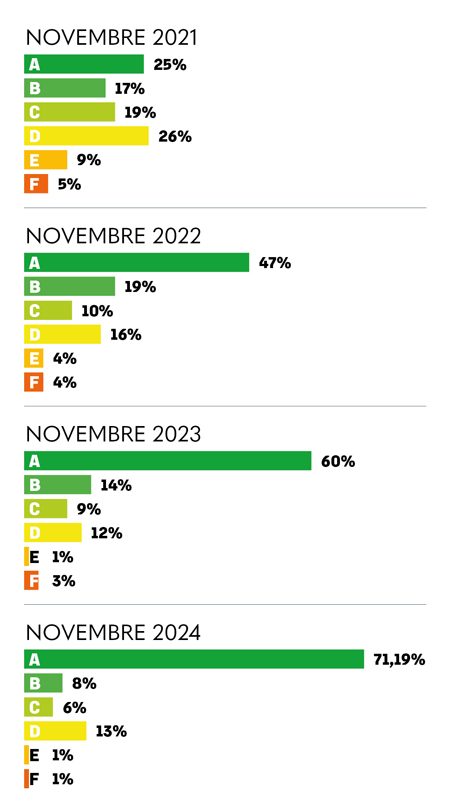 - Novembre 2024: la transizione verso la classe A non sembra arrestarsi e raggiunge il 71% dei modelli. Risulta pertanto evidente la convergenza dei produttori verso la fascia più efficiente.