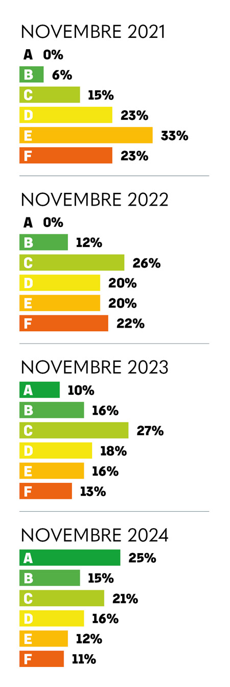 - Novembre 2023: fanno la loro comparsa i modelli di classe A, che rappresentano il 10% dell'offerta da parte dei produttori. La classe C continua ad essere la classe energetica con più modelli, 27%.