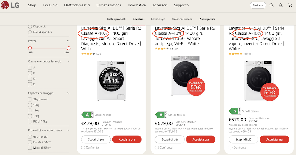Già nel 2020 per questo motivo si erano diffusi claim che riportavano diciture come A+++ -10% o A+++ -40%. La stessa situazione si sta ricreando, a soli quattro anni dall'introduzione dell'attuale etichetta energetica, con la nuova etichetta energetica, e alcuni marchi come LG e Miele stanno iniziando ad utilizzare claim come "classe A-10%" per indicare una maggiore efficienza dei propri elettrodomestici rispetto alla classe A.