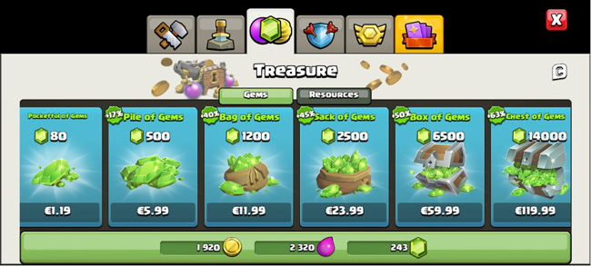 Nelle tabelle qui sotto abbiamo analizzato i casi di sette tra i più diffusi videogiochi per diverse piattaforme (smartphone, console, PC...) che offrono acquisti in-game. Torna all'inizioSupercell: Clash of Clans