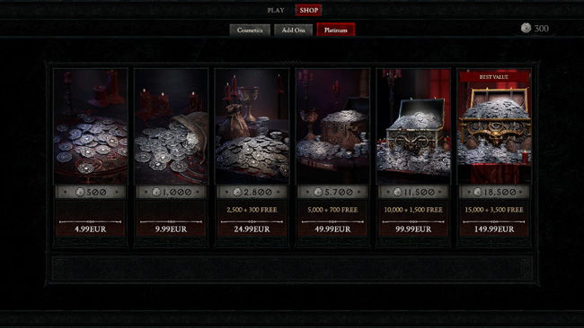 | Valute di gioco premium necessarie per effettuare acquisti in-game | Da 6 a 13 ‘Platinum’, disponibile in pacchetti da 500 "Platinum" per € 4,99 a 18.500 "Platinum" per € 149,99. |