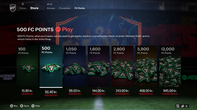 | Valute di gioco premium necessarie per effettuare acquisti in-game | ‘FC Points’, disponibili in pacchetti da 100 "FC Points" per € 0,99 a 12.000 "Punti FC" per € 99,99. |