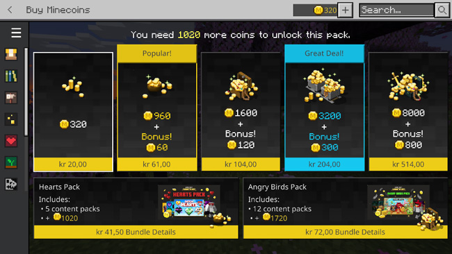| Valute di gioco premium necessarie per effettuare acquisti in-game | ‘Minecoins’ disponibile in pacchetti da 320 "Minecoin" per € 1,99 a 8.800 "Minecoin" per € 59,99. |
