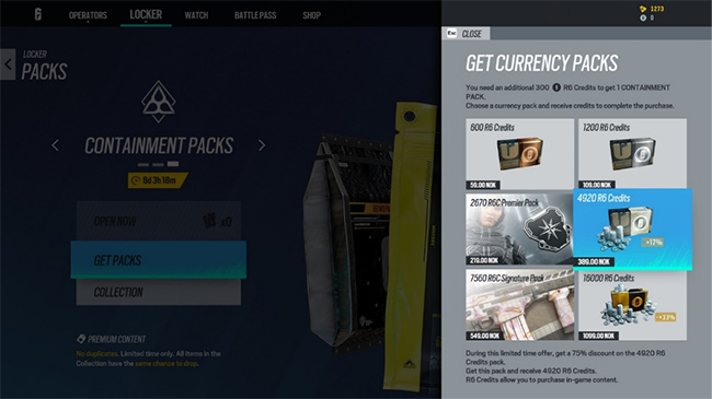 | Valute di gioco premium necessarie per effettuare acquisti in-game | ‘R6 Credits’ disponibili in pacchetti da 600 "Crediti R6" per € 4,99 a 16.000 "Crediti R6" per € 99,99. |