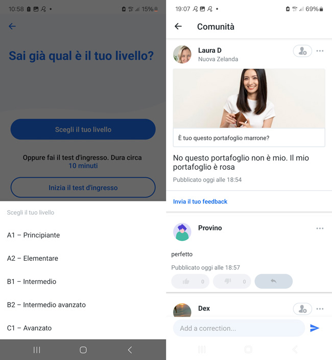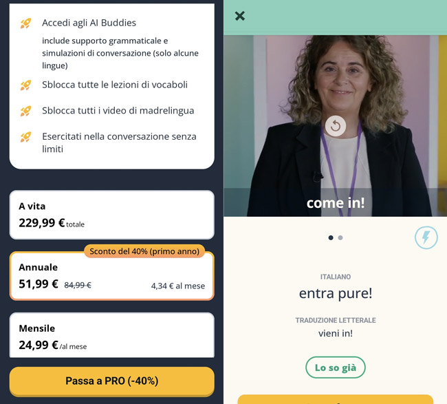 La versione gratuita di Busuu è pienamente utilizzabile; ad essa si affianca la versione premium, che consente di fare esercitazioni orali confrontandosi con un bot IA, al costo di 11€ per un mese, 66€ per sei mesi o 132 € per un anno. Quando abbiamo fatto le nostre prove le versioni a sei mesi e un anno erano scontate e quella da un anno costava addirittura meno di quella da sei mesi, quindi fate attenzione alle offerte. Le lezioni sono organizzate in maniera simile alle altre app, con esercizi interattivi e revisione dei progressi. Rispetto a Duolingo ha un’offerta adatta a più livelli di conoscenza pregressa e propone anche lezioni per gli utenti avanzati, fino a C1. L’aspetto di gamification è molto più contenuto rispetto a Duolingo. La parte più originale consiste nel ricevere feedback dagli altri utenti e anche nel poterlo fornire: si possono leggere o ascoltare gli esercizi degli altri utenti e intervenire con valutazioni e consigli.