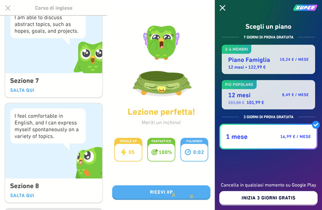 Anche le quattro app gratuite di cui abbiamo appena parlato offrono versioni a pagamento, che tipicamente prevedono la presenza di funzionalità aggiuntive come l’interazione con chatbot IA, la rimozione della pubblicità, un maggior numero di lezioni o una personalizzazione più spinta. Nonostante la versione a pagamento sono comunque tutte usufruibili con piena soddisfazione anche nella loro versione gratuita. Viceversa, altre app possono essere utilizzate gratis solo per fare qualche prova, dopo di che bisogna per forza pagare. Le tre più conosciute sono quelle che vi riportiamo qui sotto.
