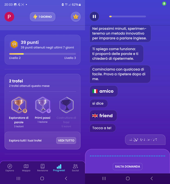 Le app gratuite cercano di aiutare a migliorare le nostre capacità di pronuncia e conversazione tramite alcuni esercizi mirati, in cui ascoltare e ripetere, e ultimamente hanno introdotto anche funzionalità di intelligenza artificiale, che permettono di sostenere dei simulacri di conversazione. Non è la stessa cosa che parlare con una persona reale che ti corregge e consiglia, ma è già qualcosa. Va però detto che le funzioni di riconoscimento vocale non si sono comportate benissimo nelle nostre prove: anche provando a pronunciare molto male le frasi che ci venivano proposte, è capitato spesso di ricevere approvazione da parte delle app.