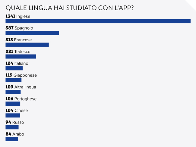 - Le lingue più imparate. Poiché queste app sono “multilingue” e oltre all’inglese offrono corsi in molte altre lingue, abbiamo anche chiesto ai nostri utenti quali lingue hanno studiato. L’inglese la fa da padrone, con oltre 1341 che lo hanno scelto, seguito da spagnolo (387), francese (313) e via via tutte le altre. Nel grafico il totale è molto più alto di 1500, perché molte persone usano queste app per studiare più di una lingua.