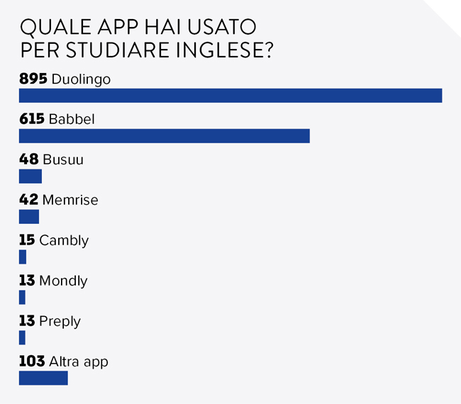 - L’app di gran lunga più utilizzata è Duolingo (895 persone hanno detto di averla usata) seguita da Babbel (615). Molto staccate Busuu (48) e Memrise (42), ancora più indietro Cambly, Mondly e Preply ciascuna scelta da meno di 20 utenti.