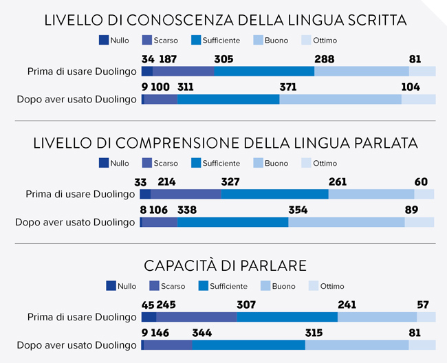 Abbiamo chiesto agli utenti di autovalutare le proprie conoscenze dell’inglese prima di usare Duolingo e dopo averlo usato: come si vede, nella conoscenza della lingua scritta, nella comprensione del parlato e anche nella capacità di parlare sono diminuite le persone che hanno risposto di avere capacità nulle o scarse e sono aumentate quelle che dicono di avere un livello buono oppure ottimo dopo aver utilizzato l'app. Trasformando questi giudizi di autovalutazione in un punteggio numerico, osserviamo un aumento medio di circa il 10%.