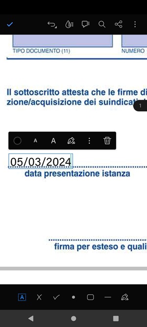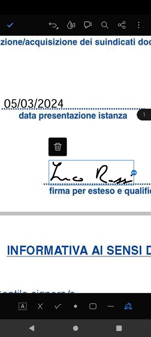 Selezionando l'ultima opzione della barra, avremo la possibilità di inserire una firma all’interno del documento. Si aprirà una schermata all’interno della quale, “scrivendo” sullo schermo touchscreen del telefono, possiamo realizzare la nostra firma. Non si tratta di un'azione semplicissima da realizzare con il dito, se non si ha a disposizione un apposito pennino.