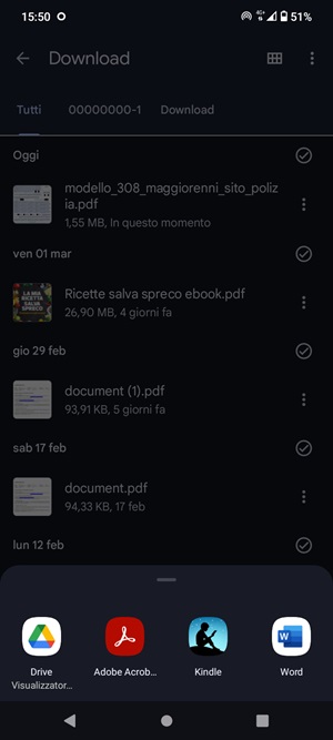 Apriamo il PDF che si desidera firmare con l'app Acrobat Reader. Premendo sul file PDF da compilare, il dispositivo ci chiederà quale app utilizzare per aprilo. Se tra le varie app presenti nel nostro telefono c'è Acrobat Reader, apparirà tra le proposte. Selezioniamo Acrobat Reader cliccando sulla sua icona: verrà chiesto se aprire sempre questo tipo di file (PDF) utilizzando quest’app, o se vogliamo poter scegliere di volta in volta. Scegliamo “Solo una volta”.