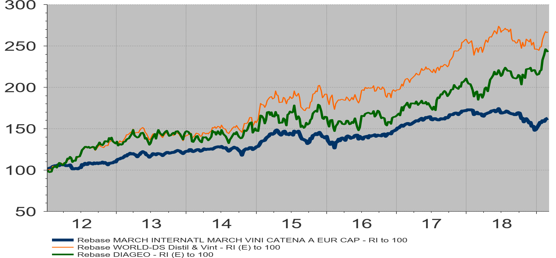 Il fondo March vina catena (grassetto; base 100) dal momento della sua quotazione (a fine 2011) si è comportato peggio della media delle azioni delle società che fanno vini e superalcolici (linea sottile). Le azioni Diageo (linea di peso intermedio) sono state, invece, più vicine al settore – dopo la debolezza per l’esito del referendum sull’uscita del Regno Unito dall’Unione Europea, negli ultimi anni si sono comportate anche meglio delle azioni delle colleghe.