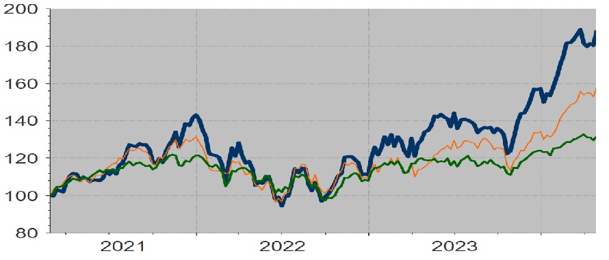 La linea in grassetto rappresenta Schneider Electric, quella intermedia le Borse europee e quella sottile il settore di riferimento (tutte base 100 e dividendi inclusi).