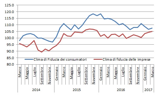 La fiducia dei consumatori italiani a marzo 2017 aumenta da 106,6 a 107,6, battendo così le attese che si attendevano un dato allineato a quello di febbraio. Marzo è un mese positivo anche per la fiducia delle imprese italiane, che è infatti salita da 104,3 a 105,1, raggiungendo il livello più elevato da gennaio 2016.