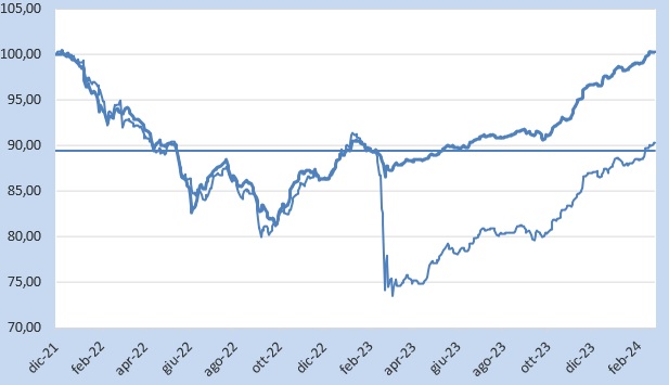 La linea in grassetto è il mercato dei bond subordinati high yield, la linea sottile il fondo Lazard e la line orizzontale rappresenta il prezzo del fondo all'8/03/23