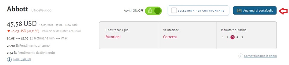 Se si tratta di un’azione, un fondo, un ETF, un’obbligazione presenti sul sito di Altroconsumo Investi, allora puoi utilizzare il pulsante «Aggiungi al portafoglio», situato in alto a destra della pagina del titolo in questione (indispensabile per essere sicuro di ritrovare il consiglio di Altroconsumo Investi nel mio portafoglio).