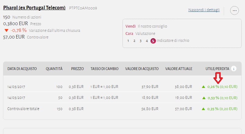 Per consultare la performance di un titolo dalla data di acquisto, clicca su «Mostra i dettagli». Vedrai così l’andamento del titolo da ogni data di acquisto (in base ai prezzi registrati al momento dell’acquisto o da te modificati). La linea in basso mostra l’insieme dei diversi acquisti effettuati per il titolo consultato.