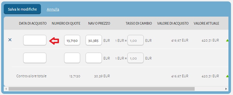 Puoi salvare le modifiche se hai introdotto una data d’acquisto. Se non lo fai, lo spazio riservato alla data diventa rosso, per invitarti a introdurre una data. Attenzione! La variazione che si vede sulla destra resta calcolata come nella versione precedente del programma. Per evitare qualsiasi confusione, introduci una data d’acquisto corrispondente alla realtà per il titolo in questione.