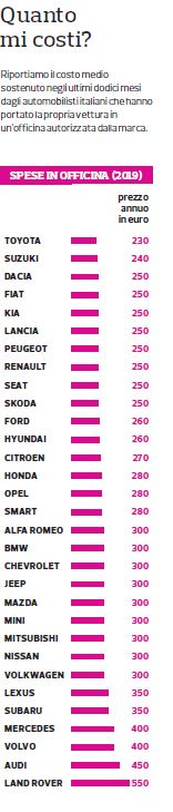 Per quanto riguarda invece il costo medio per la manutenzione dell’auto sostenuto dagli automobilisti nell’ultimo anno, al primo posto si piazza ancora una volta Toyota con 230 euro l’anno, seguita da Suzuki a 240, mentre agli ultimi posti figurano Audi con 450 euro e Land Rover con 550 euro.