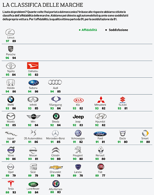 Gli intervistati hanno risposto a domande come “L’auto dà problemi? Quante volte l’hai portata dal meccanico?” e in base alle risposte è stata stilata una classifica che mette al primo posto le auto delle marche che fanno capo alla multinazionale giapponese Toyota: Lexus in primis ma anche Daihatsu e Subaru (oltre che lo stesso marchio Toyota). Si piazzano bene anche il lussuoso brand Porche e Audi (entrambe del gruppo Volkswagen) e Honda. Agli ultimi posti invece si piazzano le quattroruote made in Italy: Lancia, Fiat e Alfa Romeo.