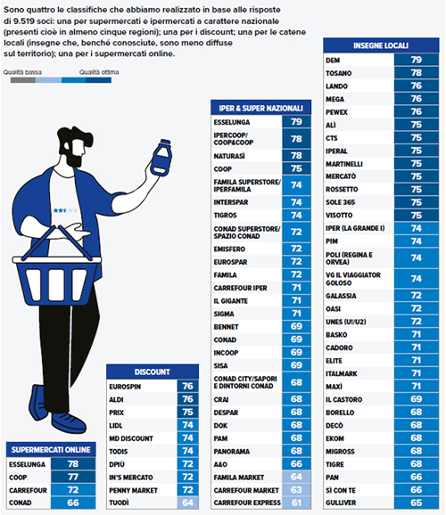 Guardando ai risultati complessivi il podio della categoria iper&super nazionali è occupato anche quest’anno da Esselunga, seguita a brevissima distanza da Ipercoop/Coop&Coop e NaturaSì, un’insegna votata all’alimentazione biologica, che conquista i consumatori più attenti all’ambiente con la qualità dei prodotti. Fra le insegne locali (ovvero presenti soltanto in alcune regioni) spiccano invece Dem, una catena con diversi supermercati dislocati tra Roma e Frosinone, che si aggiudica il primo posto, seguita da Tosano, un gruppo di 19 supermercati presenti nelle province di Verona, Vicenza, Brescia, Venezia, Mantova, Treviso, Ferrara, Padova e Udine, particolarmente attraenti per i loro prezzi. Passando poi ai discount, dove è il prezzo è il driver principale di acquisto, i preferiti risultano essere Eurospin e Aldi.