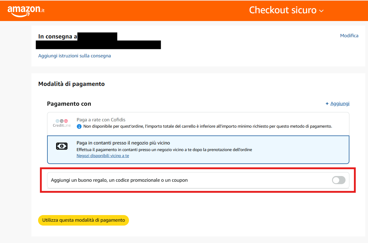 Se invece disponi di un buono regalo, un codice promozionale o un altro tipo di coupon, puoi inserirlo direttamente nella pagina del pagamento, nella sezione “Aggiungi un buono regalo, un codice promozionale o un coupon”.