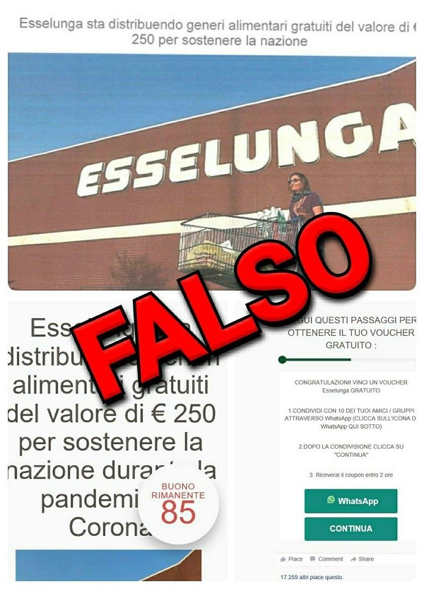 “Esselunga sta distribuendo generi alimentari gratuiti del valore di 250 € per sostenere la nazione durante la pandemia da coronavirus”