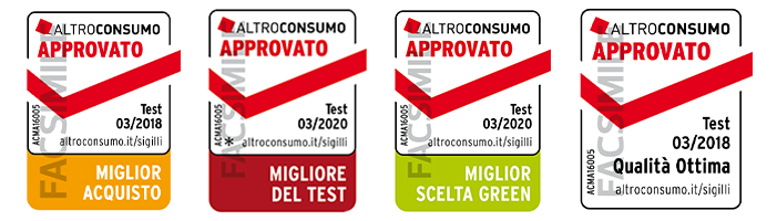 Dai risultati dei nostri test e delle nostre analisi comparative assegniamo tre titoli: il Miglior Acquisto è il prodotto con il miglior rapporto qualità-prezzo, il Migliore del Test è il prodotto che ha ottenuto il punteggio complessivo più alto, rispetto a tutti i testati, Qualità Ottima è il titolo che spetta a tutti i prodotti che hanno i punteggi migliori nei nostri test, subito dopo il Migliore del test. Il titolo Miglior scelta Green è attribuito solo ai prodotti con cinque stelle nell'impatto ambientale e con un giudizio buono o ottimo nella qualità globale.