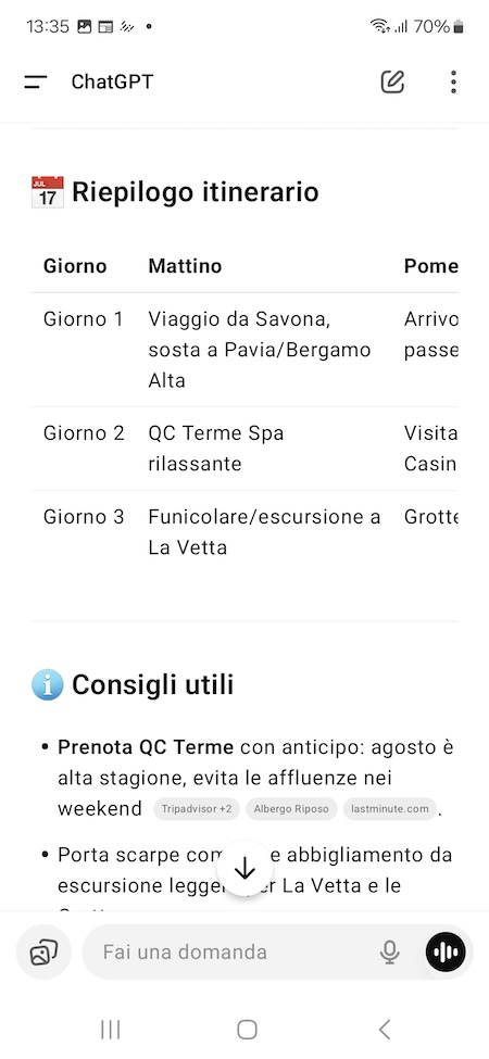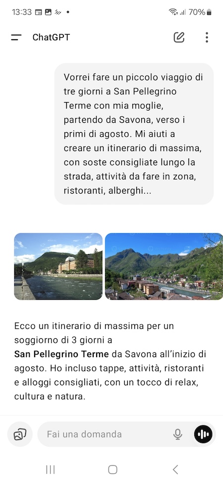 Così come lo smartphone è rapidamente passato da telefono a oggetto con cui si possono fare innumerevoli cose che prima richiedevano oggetti dedicati, oggi anche i chatbot IA, e in particolare ChatGPT, stanno iniziando a essere usati per molteplici scopi. Uno di questi scopi è fungere da consigliere di viaggio: puoi interpellare ChatGPT come quando si interpella il fidato agente di viaggio, ad esempio dicendogli che tipo di vacanza hai in mente e facendoti consigliare uno o più itinerari. Continuando a interagire con il chatbot puoi affinare l’itinerario, inserire nuove tappe, chiedere consigli riguardo a possibili deviazioni e molto altro ancora.