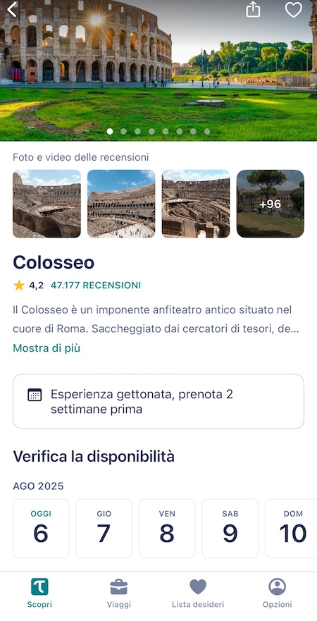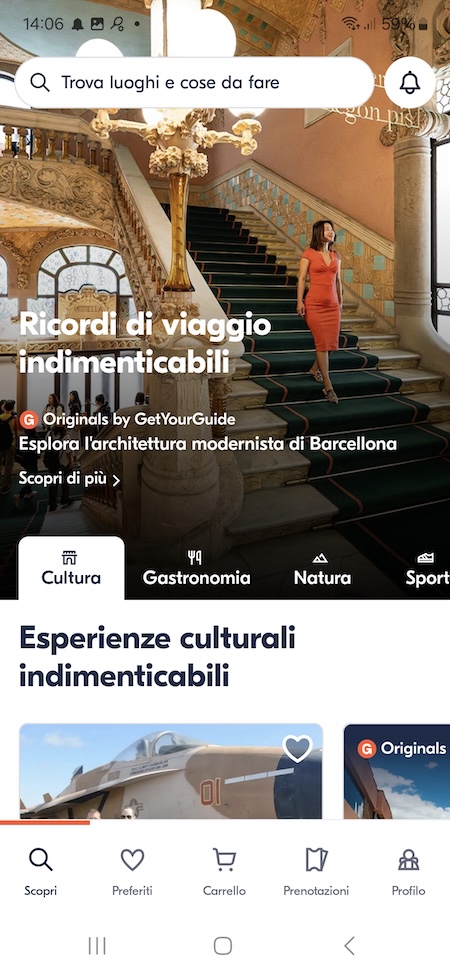 Raccoglie escursioni e visite guidate organizzate da operatori locali in oltre 100 destinazioni. Oltre ai classici tour in bus, trovi proposte a tema (fotografia, cucina, archeologia) e attività insolite (passeggiate notturne, laboratori artigianali), tutte prenotabili direttamente dall’app. Le schede delle attività indicano con precisione orari, punti di incontro e durata, e permettono di evitare sorprese in loco. La sezione “Cancellazione” consente di modificare data o orario senza costi aggiuntivi fino a 48 ore prima.