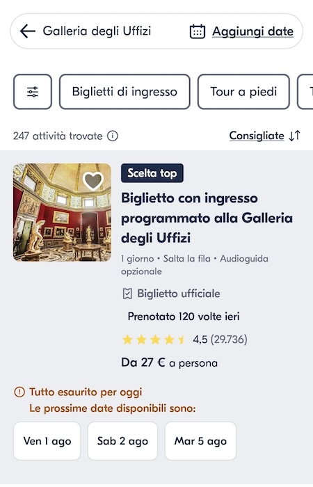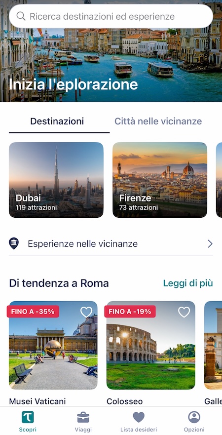 Propone tour guidati, esperienze gastronomiche e attività in tutto il mondo, filtrabili per categoria e durata. Ogni esperienza è corredata da descrizioni dettagliate, itinerari, foto. La politica di cancellazione gratuita fino a 24 ore prima offre serenità in caso di imprevisti. Le recensioni verificate aiutano a capire il reale valore dell’attività. L’opzione “Salta la fila” per musei e attrazioni è un vantaggio in alta stagione.