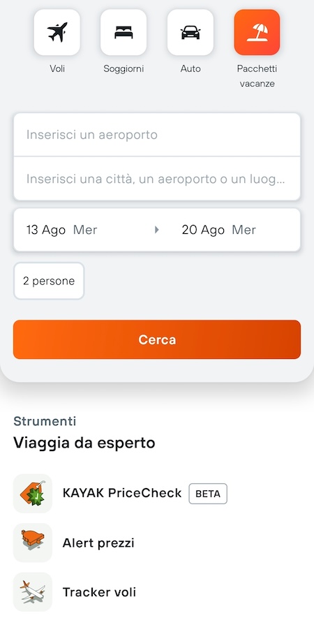 Kayak aggrega offerte di voli, hotel, noleggio auto e pacchetti vacanze da centinaia di siti, presentandole in un’interfaccia chiara e veloce. Il funzionamento è analogo a quello di Skyscanner e Google Flights: si possono cercare date e destinazioni precise oppure periodi di massima ed esplorare tra tutte le destinazioni possibili. Quando si cerca un volo è possibile selezionare tutta una serie di opzioni relative agli orari, al numero di scali, ai bagagli. È possibile impostare "Alert" personalizzati per ricevere notifiche via app o e‑mail sulle variazioni tariffarie. La funzionalità Tracker voli permette di ricevere informazioni sullo status di un volo che stiamo tenendo d'occhio.
