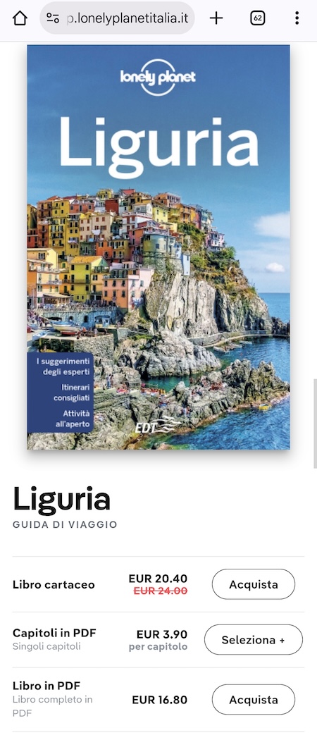 Se preferisci un approccio più tradizionale, leggendo quindi una classica guida turistica, ci sono due cose da sapere. Una è che ci sono tante app “guida turistica” ma nessuna è strutturata come le guide turistiche classiche: le informazioni da leggere sono poche o nulle e l’accento è sulle informazioni pratiche, per le quali si sfruttano le funzionalità di geolocalizzazione del telefono. L’altra cosa da sapere è che sul sito della più famosa guida turistica, Lonely Planet, puoi acquistare le versioni in PDFdelle guide della casa editrice, che pubblica guide per tutto il mondo. L'aspetto cosa interessante è che puoi anche acquistare i singoli capitoli, così che se per esempio ti interessa solo una città di una data regione, non sei costretto ad acquistare anche tutto il resto della guida. Una volta acquistato il PDF, lo puoi scaricare e tenere sul telefono, con la comodità di poterlo consultare anche quando non sei collegato a internet.