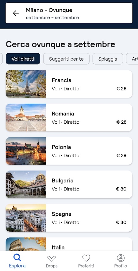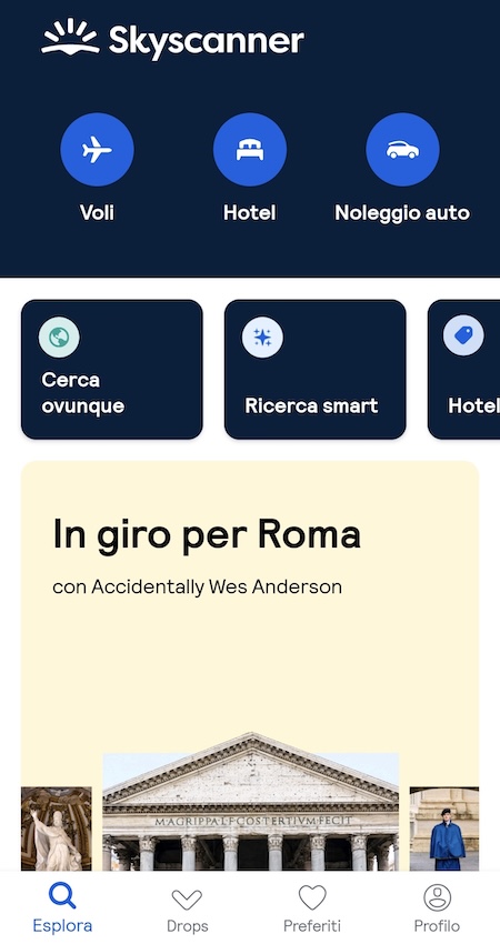Skyscanner è un motore di ricerca voli che confronta le offerte di centinaia di compagnie aeree per offrirti la tariffa migliore in pochi secondi. La visualizzazione su calendario mensile permette di individuare rapidamente i giorni meno costosi, anche spostando di qualche giorno il viaggio. I filtri ti aiutano a selezionare orari di partenza, durata degli scali e compagnie preferite, ed è possibile anche cercare voli per viaggi con destinazioni multiple. Le offerte “Ovunque” suggeriscono destinazioni ordinate a partire dalla più economica. La funzione “Drops” mostra voli il cui prezzo è sceso nelle ultime 24 ore mentre segnando un volo tra i preferiti si potranno ricevere notifiche se ci sono variazioni di prezzi.