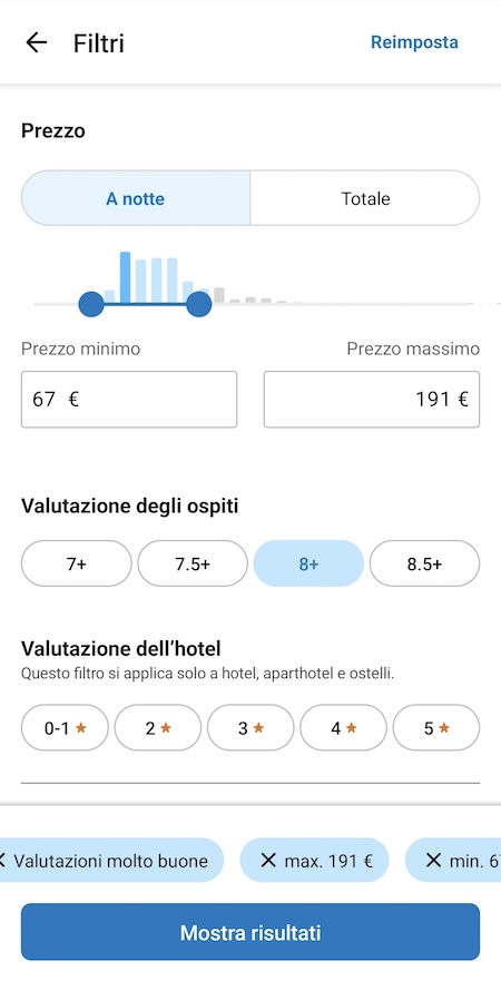 È la più grande agenzia di viaggio online al mondo; offre un catalogo vastissimo di hotel, B&B, appartamenti e ostelli in tutto il mondo. Con la ricerca puoi filtrare, oltre che per città e data, anche per prezzo, categoria di struttura, servizi inclusi (colazione, parcheggio, piscina) e condizioni di cancellazione. Le recensioni verificate degli ospiti, spesso corredate da foto, aiutano a valutare in anticipo la qualità della sistemazione. La politica “prenota ora, paga dopo” offre flessibilità a chi è ancora indeciso sull’effettiva concretizzazione del viaggio. Da notare che secondo una nostra inchiesta prenotare telefonando direttamente all’albergo o andando sul sito dell’albergo consente di ottenere tariffe più convenienti rispetto alla prenotazione via Booking (ma anche via Trivago ed Expedia) in tre casi su quattro.