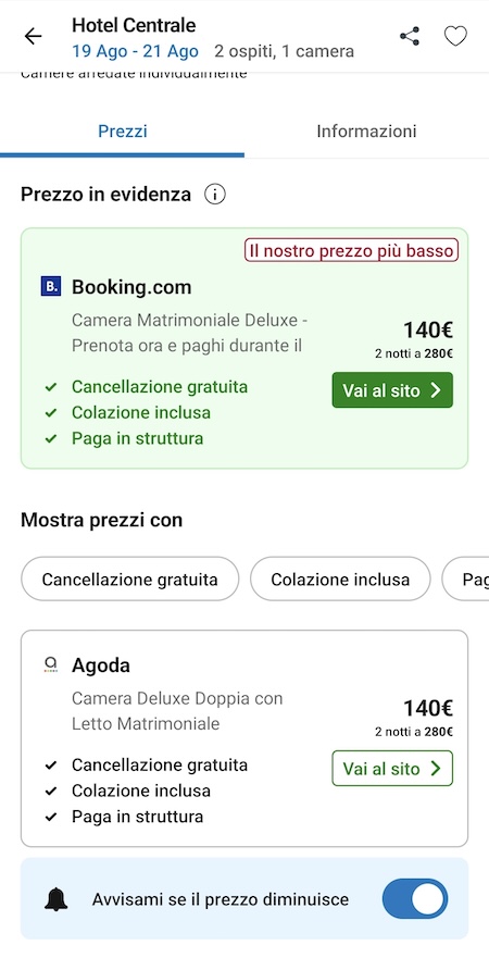 Trivago funziona da comparatore di tariffe per strutture ricettive, aggregando offerte da decine di siti di prenotazione. Inserisci destinazione e date e ottieni in pochi secondi informazioni su una serie di alberghi, con evidenziato il prezzo minimo trovato. Cliccando sull’albergo puoi visualizzare al volo le offerte sui vari siti. Se un’offerta ti interessa, con un tocco verrai portato alla piattaforma di prenotazione scelta. È possibile attivare le notifiche per ricevere informazioni su eventuali variazioni di prezzo. L’interfaccia evidenzia in modo chiaro eventuali promozioni e la possibilità di cancellazione gratuita e rende anche molto semplice confrontare tra loro due strutture.
